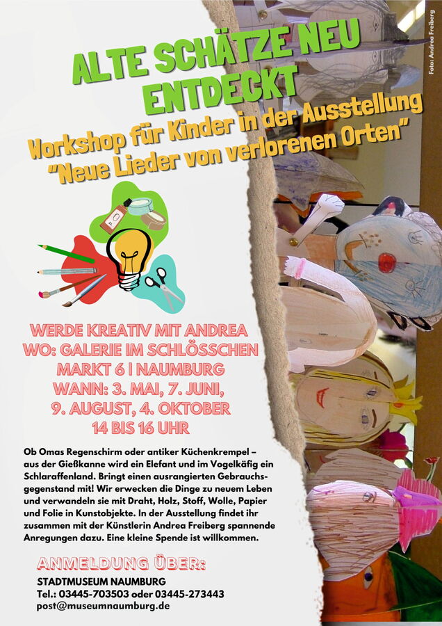 Ob Omas Regenschirm oder antiker Küchenkrempel – aus der Gießkanne wird ein Elefant und im Vogelkäfig ein Schlaraffenland. Bringt einen ausrangierten Gebrauchsgegenstand mit! Wir erwecken die Dinge zu neuem Leben und verwandeln sie mit Draht, Holz, Stoff, Wolle, Papier und Folie in Kunstobjekte. In der Ausstellung „Neue Lieder von verlorenen Orten“ findet ihr zusammen mit der Künstlerin Andrea Freiberg spannende Anregungen dazu. Eine kleine Spende ist willkommen.